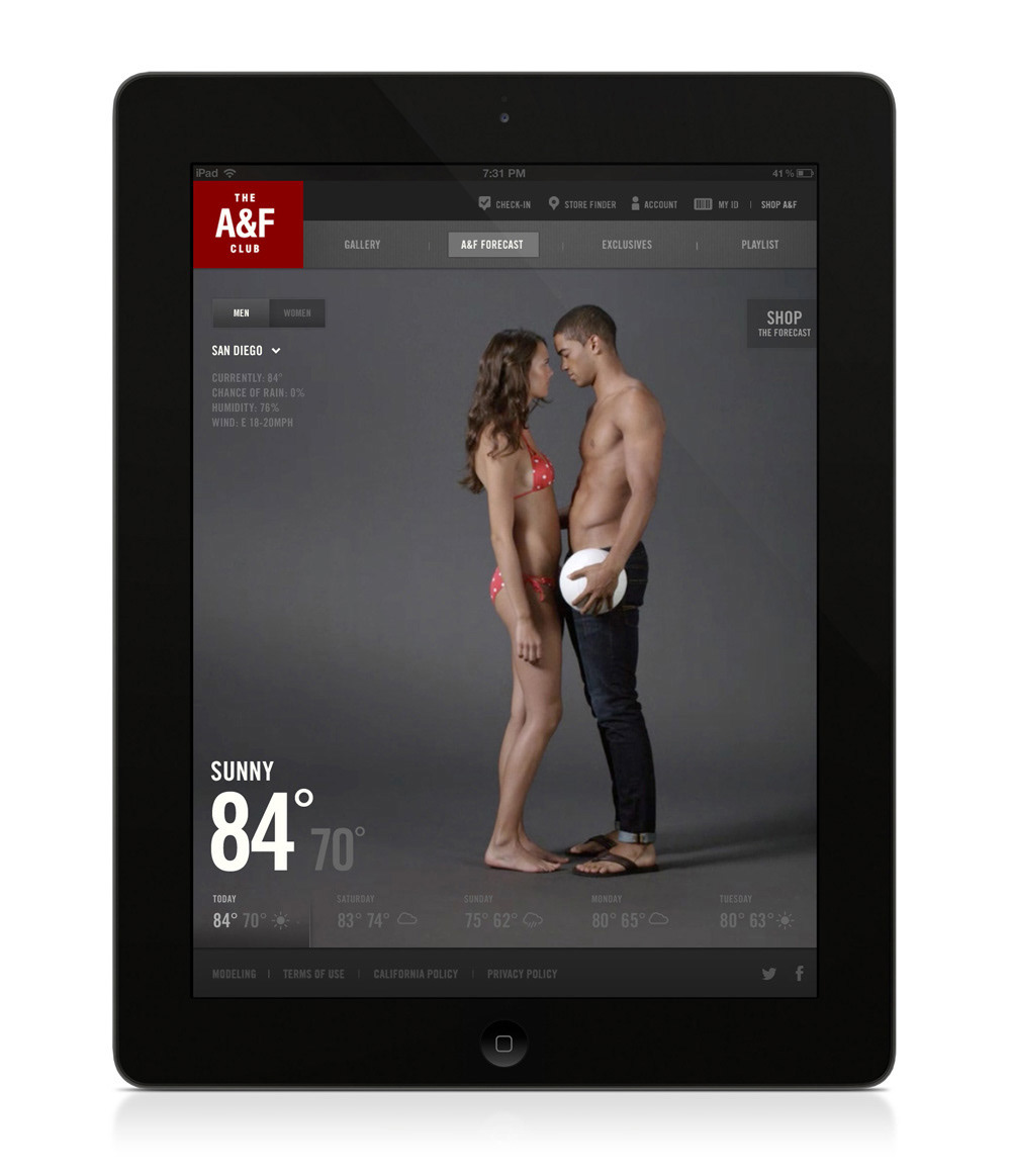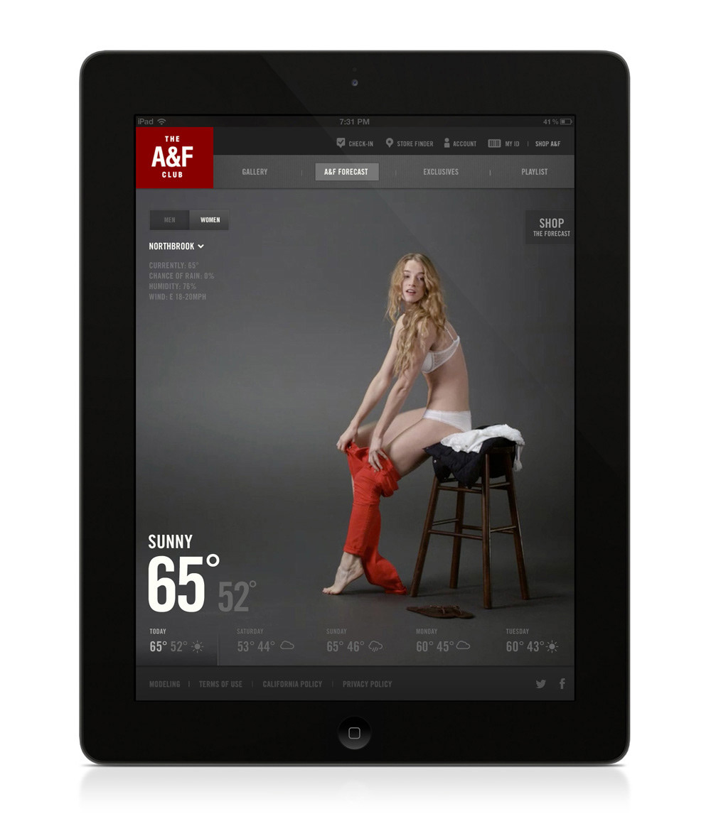 The daily forecast brought to you in a way only Abercrombie can. 130+ video clips featuring hot models wearing the latest styles paired appropriately with temperature and weather conditions. Exclusively for A&F Club members.