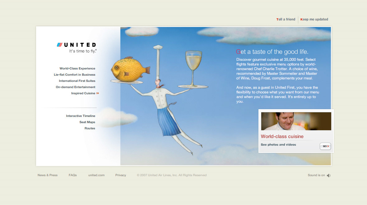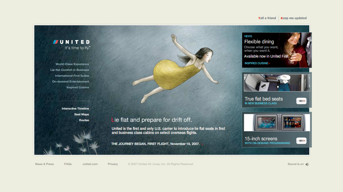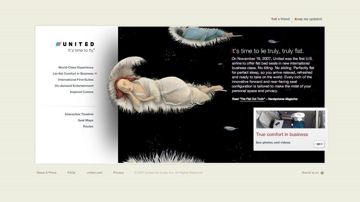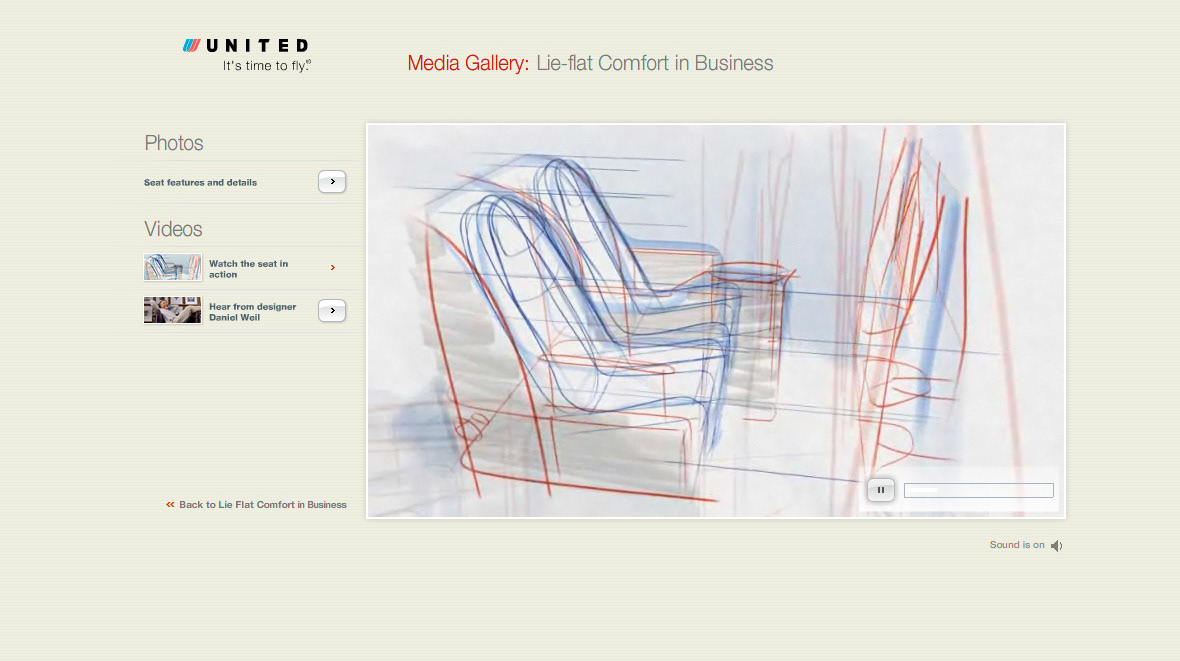 Reveal and rollout of United Airlines totally re-invented International Business Class seating, revolving around a true lie-flat bed.